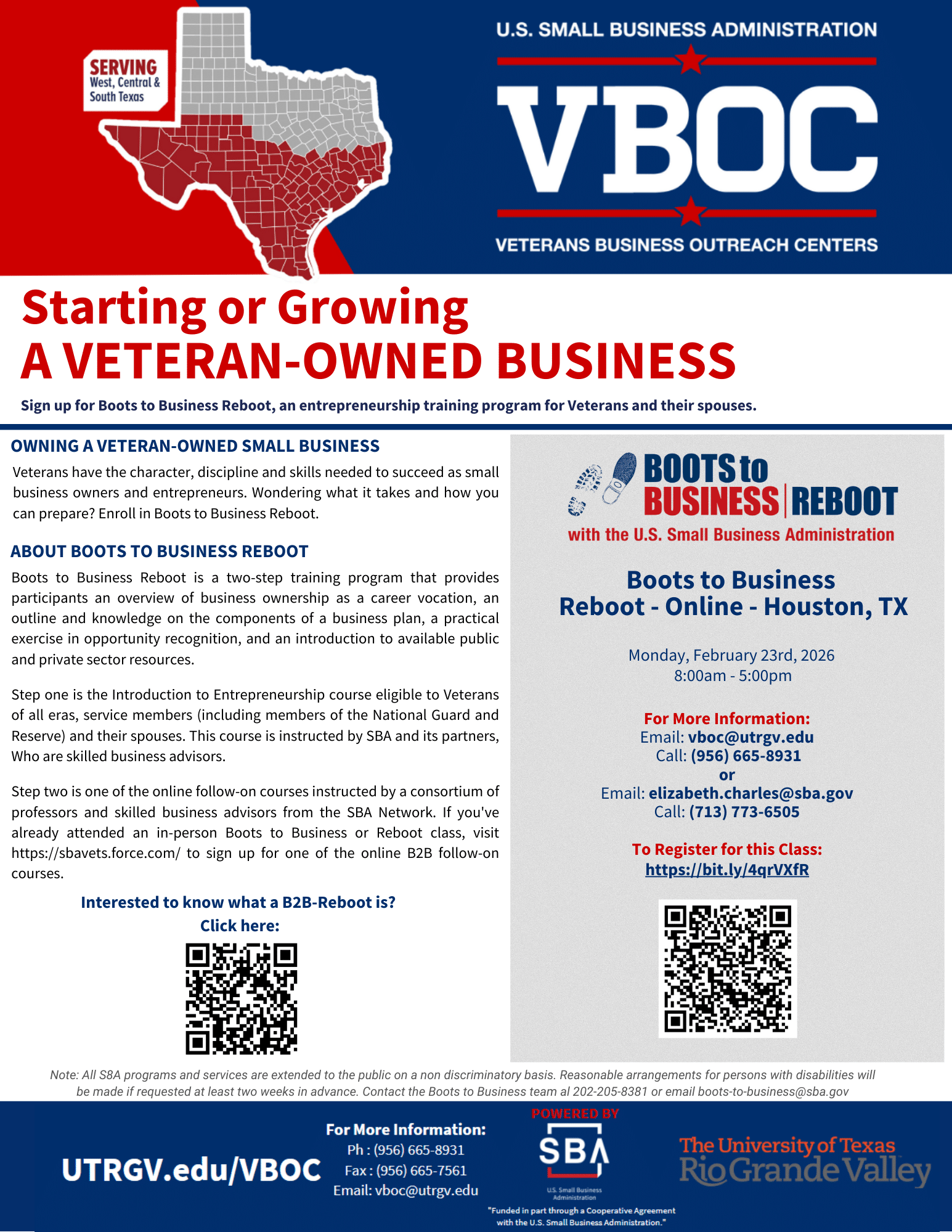 Join the SBA Houston District Office and the UTRGV Veterans Business Outreach Center for Boots to Business Reboot (B2BR) a powerful entrepreneurial training program designed specifically for Veterans, Active-Duty Service Members (including National Guard & Reserve), and Military Spouses.
